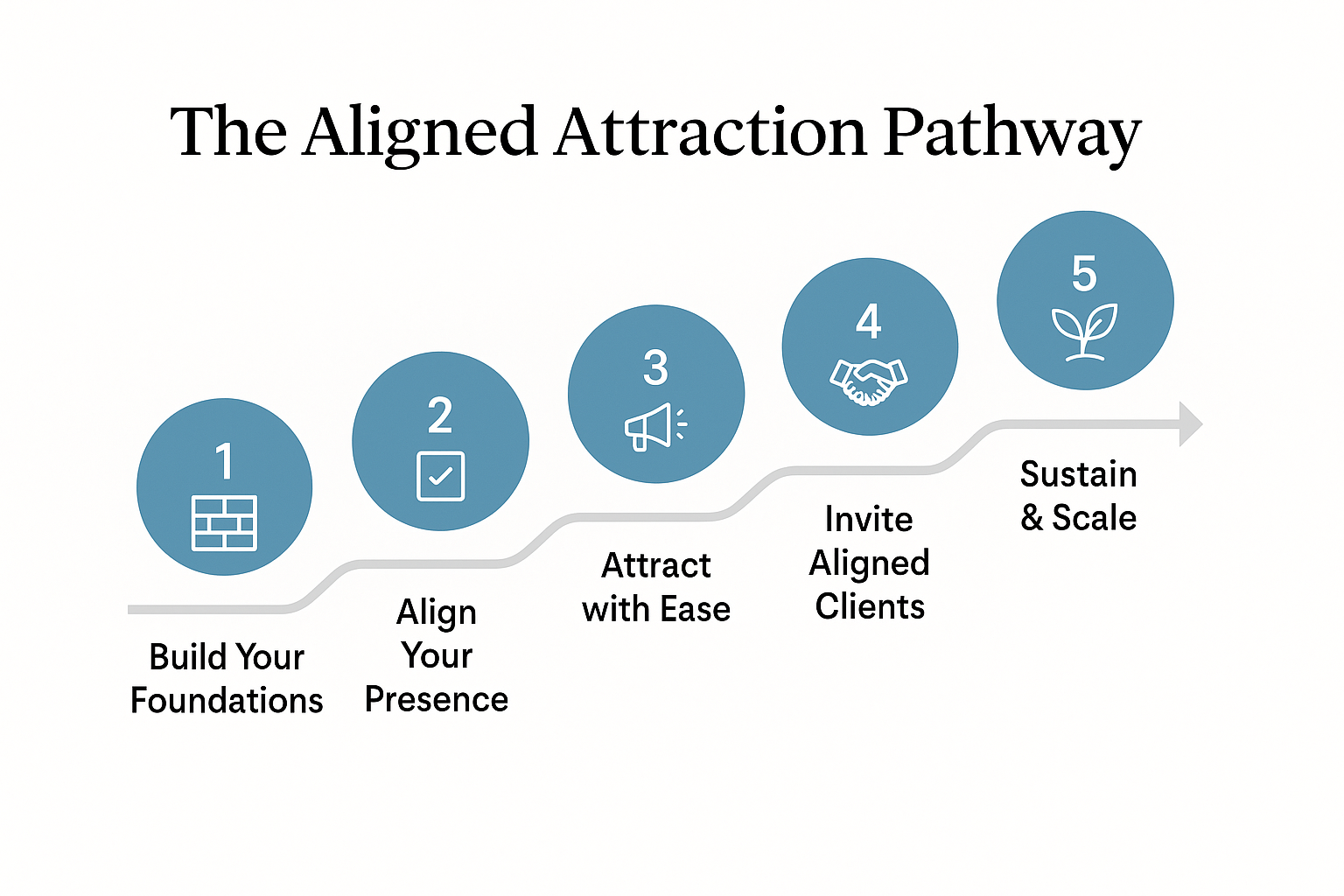 The Aligned Attraction Pathway™ gives you a clear roadmap — from unclear and undercharging to confident, in-demand, and consistently booked.